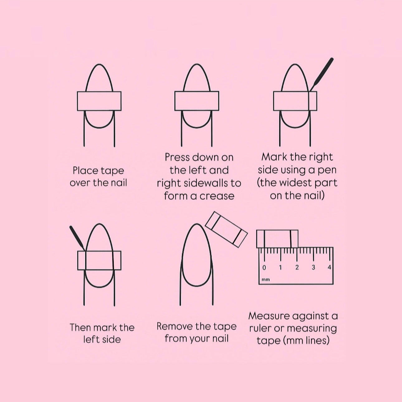 Measure each nail in millimeters and refer to our sizing chart to find your closest match. This ensures your press-ons fit comfortably and look seamless